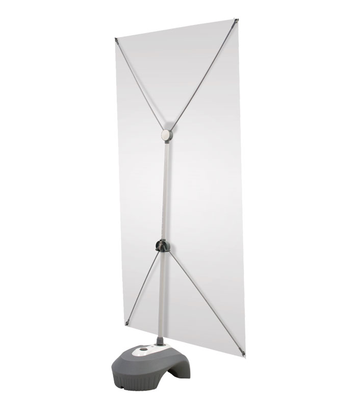 Soporte X-Banner con Base Rellenable Kiel. Un modelo de soporte publicitario perfecto para exterior, ya que sus base se rellena de 20l de agua o arena por lo que es resistente a condiciones ambientales adversas como rachas de viento. Este display publicitario de exterior está fabricado con aluminio y plástico. Este banner publicitario es perfecto para eventos organizados al aire libre, ferias, congresos… La gran superficie que ocupa la gráfica provoca un gran impacto visual.
